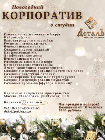 Что входит: МК на выбор, 3 часа аренды студии (студия закрыта для других гостей). Бонусный час в подарок - для фуршета, дискотеки или других активностей. Включена роспись изделий, пищевая прозрачная глазурь, полный цикл производства керамики, включая 2 обжига. Викторина для гостей с ценным призом от студии